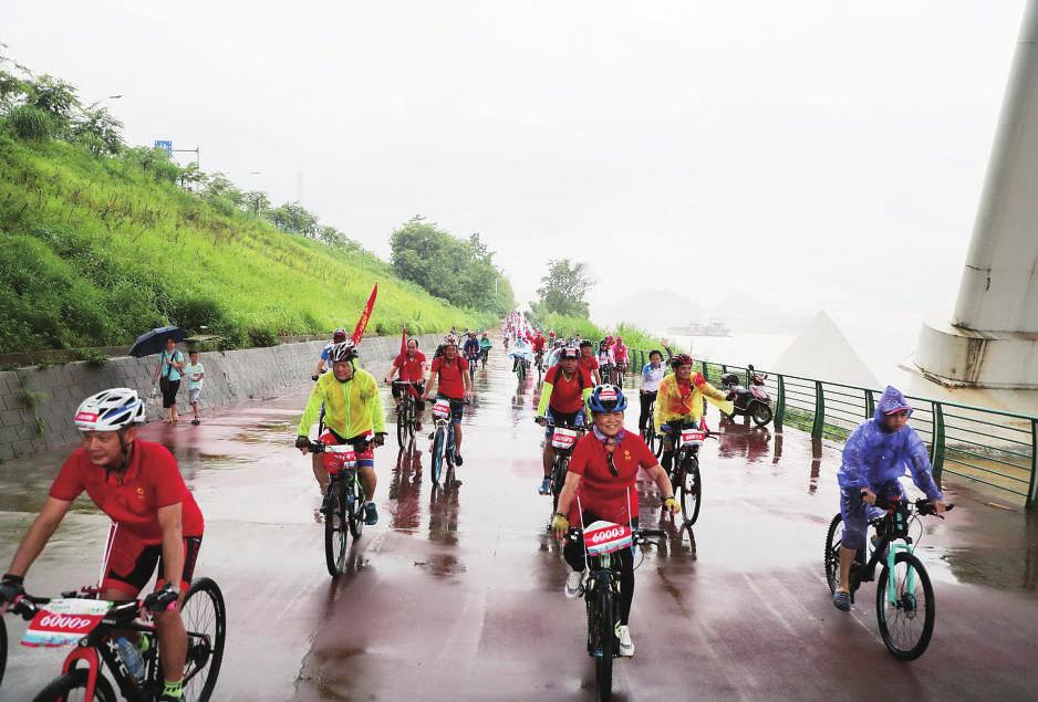 在短暫的熱身運(yùn)動(dòng)后,騎行活動(dòng)正式開始。韓宗桂等領(lǐng)導(dǎo)帶隊(duì)率先出發(fā),各支騎行隊(duì)伍緊隨其后,一條紅色的火焰瞬間在柳江河畔蔓延開來。騎手們克服雨天路面濕滑的困難和考驗(yàn),用手去擦拭流入眼睛的雨水,避免影響視線。大家在騎行過程中相互鼓舞、相互扶持,不拋棄、不放棄,將柳鋼人團(tuán)結(jié)互助、不畏艱險(xiǎn)的精神發(fā)揚(yáng)光大,參與的職工全部都順利完成了此次騎行。